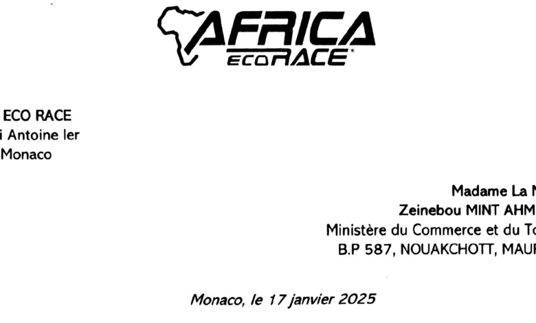 تلقت وزيرة التجارة والسياحة، زينب بنت أحمدناه، رسالة شكر من منسق عام سباق “أفريقيا البيئي” (Africa Eco Race)، أنتوني شليسر، نيابة عن الفريق المنظم والمشاركين في النسخة الـ16 من السباق، التي مرت عبر الأراضي الموريتانية خلال بداية العام 2025.
