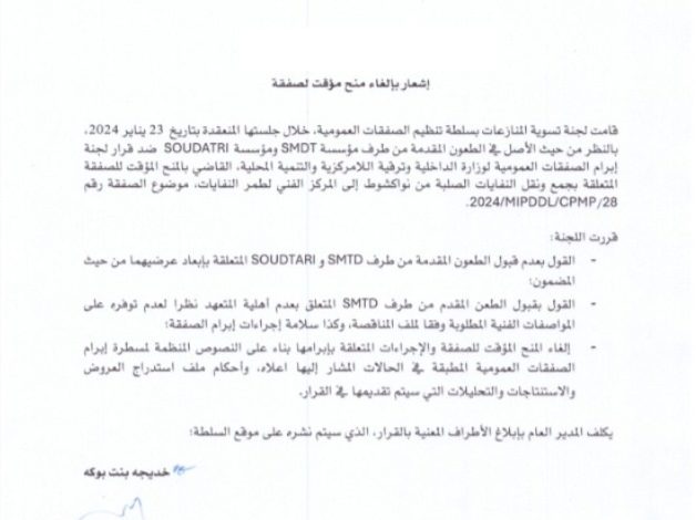 واتخذت لجنة تسوية المنازعات في السلطة قرارها خلال جلسة عقدتها أمس الخميس 23 يناير 2024 للنظر من حيث الأصل في الطعون المقدمة من طرف مؤسسة SMDT ومؤسسة SOUDATRI ضد قرار لجنة إبرام الصفقات العمومية لوزارة الداخلية وترقية اللامركزية والتنمية المحلية، القاضي بالمنح المؤقت للصفقة المتعلقة بجمع ونقل النفايات الصلبة من نواكشوط إلى المركز الفني لطمر النفايات، موضوع الصفقة رقم: 2024/MIPDDL/CPMP/28.
