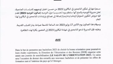 (إحاطة)- أعلنت وزارة التعليم العالي والبحث العلمي أنها ستنظم صالونا توجيهيا لصالح الطلاب الناجحين في الباكلوريا 2023. ودعت مديرية التوجيه…