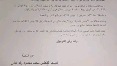 (إحاطة)- أعلنت اللجنة الوطنية لمراقبة الأهلة ثبوت هلال شهر ذي الحجة مساء اليوم برؤية مستفيضة في نواذيبو وكوركول. وقالت اللجنة…